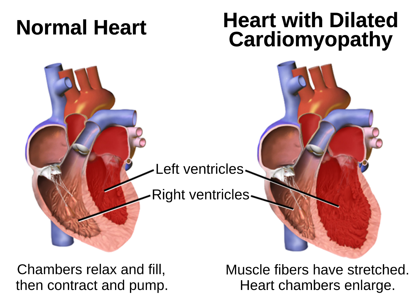 Figure 1 - Gross pathology image of a heart with dilated cardiomyopathy showing enlarged, globoid cardiac chambers with thinned ventricular walls compared to a normal heart