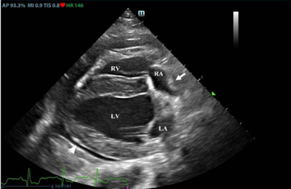Figure 5 - Right parasternal echocardiogram showing anechoic pericardial effusion surrounding the heart with visible right atrial collapse during diastole. (A) Echocardiography in parasternal long axis. Arrow shows the posterior displacement of the apex and the lack of the typical round left ventricular apex. Cardiovascular magnetic resonance showing the clockwise rotation. Compared with the prone position (B), leftward posterior rotation of the heart is seen in when patient is in supine position (C).