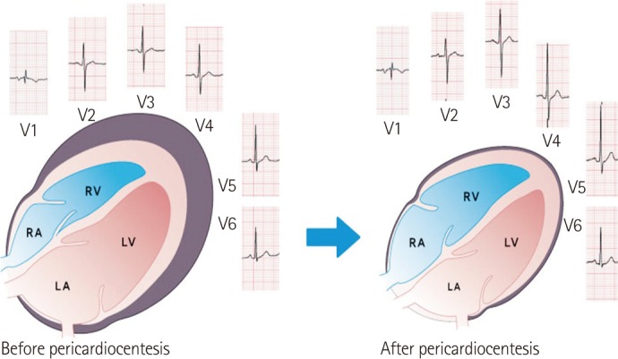 | Low-voltage QRS complexes | R wave less than 1.0 mV in lead II; fluid insulates electrical signal |