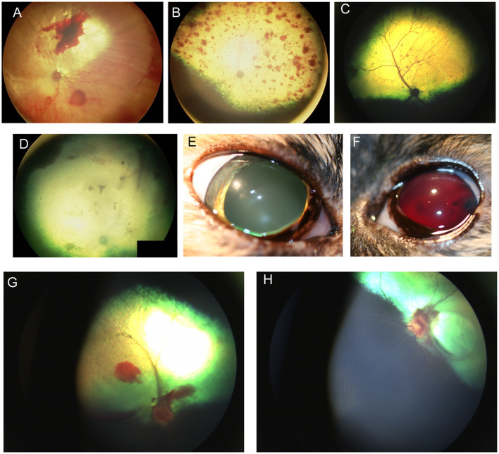 Figure 2 - Hypertensive Retinopathy showing retinal hemorrhage and detachment. (A) Subalbinotic fundus of the right eye of a cat manifesting with subretinal and intraretinal (punctate) hemorrhages of unknown etiology. Tapetal hyperreflectivity and vascular attenuation are also visible. (B–F) Feline hypertensive retinopathy. (B) Multifocal retinal hemorrhages ranging in size from punctate to one optic nerve in diameter, along with tapetal hyperreflectivity and vascular attenuation. Upon presentation the patient had a systolic blood pressure of 215 mmHg and a hematocrit of 20 and a prolonged aPTT at 89.6s (Ref 23.6–54.9s). The cat later became blind and recumbent. Humane euthanasia was elected and a necropsy showed chronic renal failure and a cerebellar hemorrhage. (C) Multifocal punctate retinal hemorrhages and retinal lesions. This cat was diagnosed with a functional adrenal carcinoma and secondary hyperaldosteronism and a systolic blood pressure of 300 mmHg. (D) Right fundus, (E) right eye, and (F) left eye of a cat suffering from hypertensive retinopathy in the right eye, and hypertensive oculopathy in the left. (D) the fundic vasculature is greatly attenuated and the retina is hyporeflective. There are punctate intra-retinal hemorrhages, subretinal and vitreal hemorrhages. (E) the pupil is dilated and non-responsive to light. (F) Hyphema and blood clots are formed in the anterior chamber. (G) Optic neuritis, subretinal and vitreal hemorrhage in the right eye of a dog affected by immune mediated thrombocytopenia. (H) Optic neuritis with flame shaped hemorrhages tracking along the nerve fiber layer, subretinal hemorrhages and focal retinal atrophy in the left eye of the same dog.